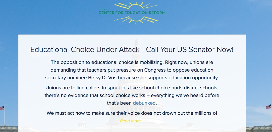 SPEAKING OF DEVOS. US Education Secretary nominee Betsy DeVos’ confirmation hearing has been moved to January 17th at 5pm “at request of Senate leadership to accommodate Senate schedule,” according to HELP Committee chair Senator Lamar Alexander. That means more days ahead of “outrageous and contradictory” rhetoric from those in the business of maintaining the status quo. Offender #1, of course, being the AFT, with President Randi Weingarten giving a speech yesterday at the National Press Club designed to scare teachers into calling their US Senators to spout off lies about DeVos’ record and educational choice. EdReformers are fighting back — call your US Senator so lies do not outweigh the truth about parent power.