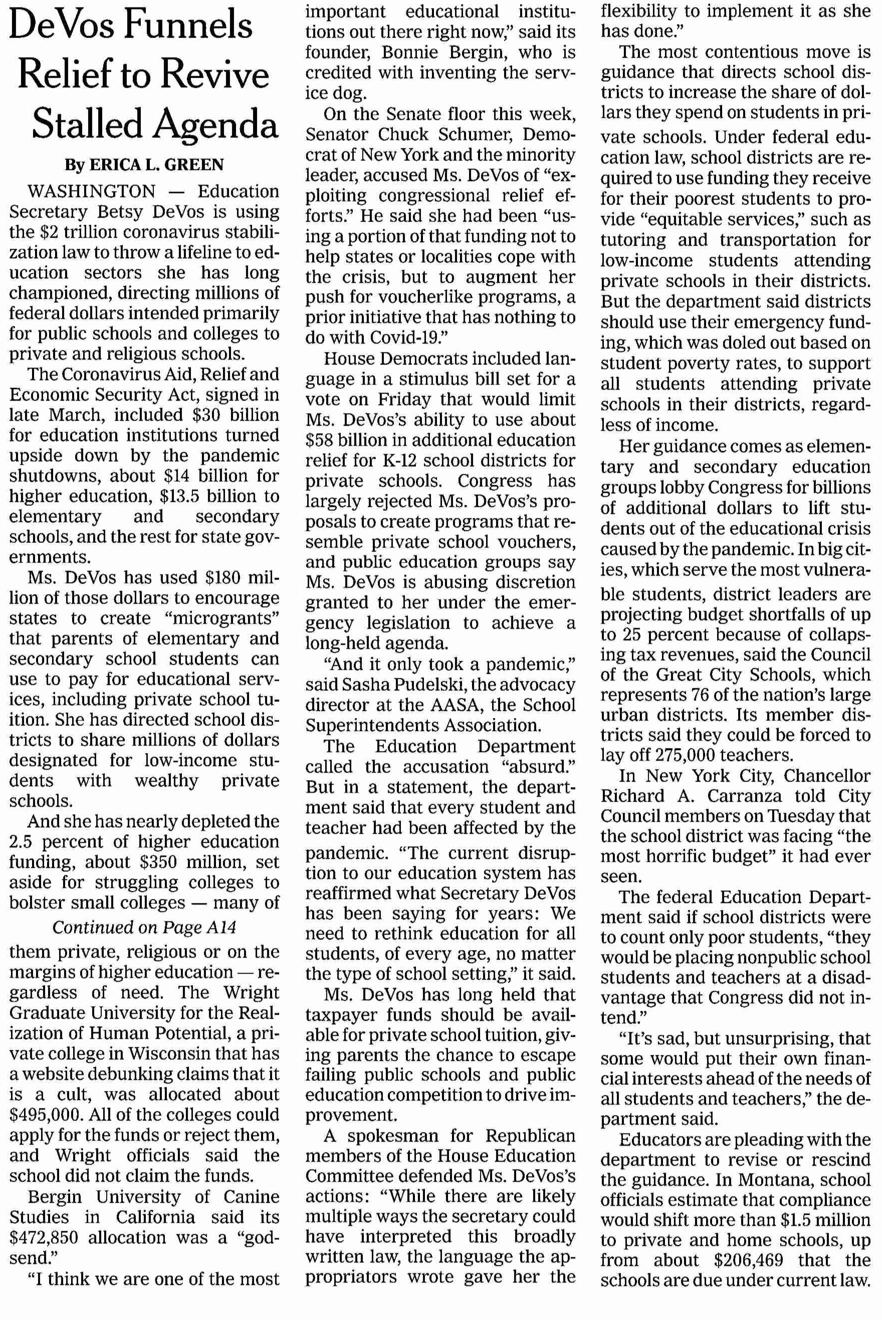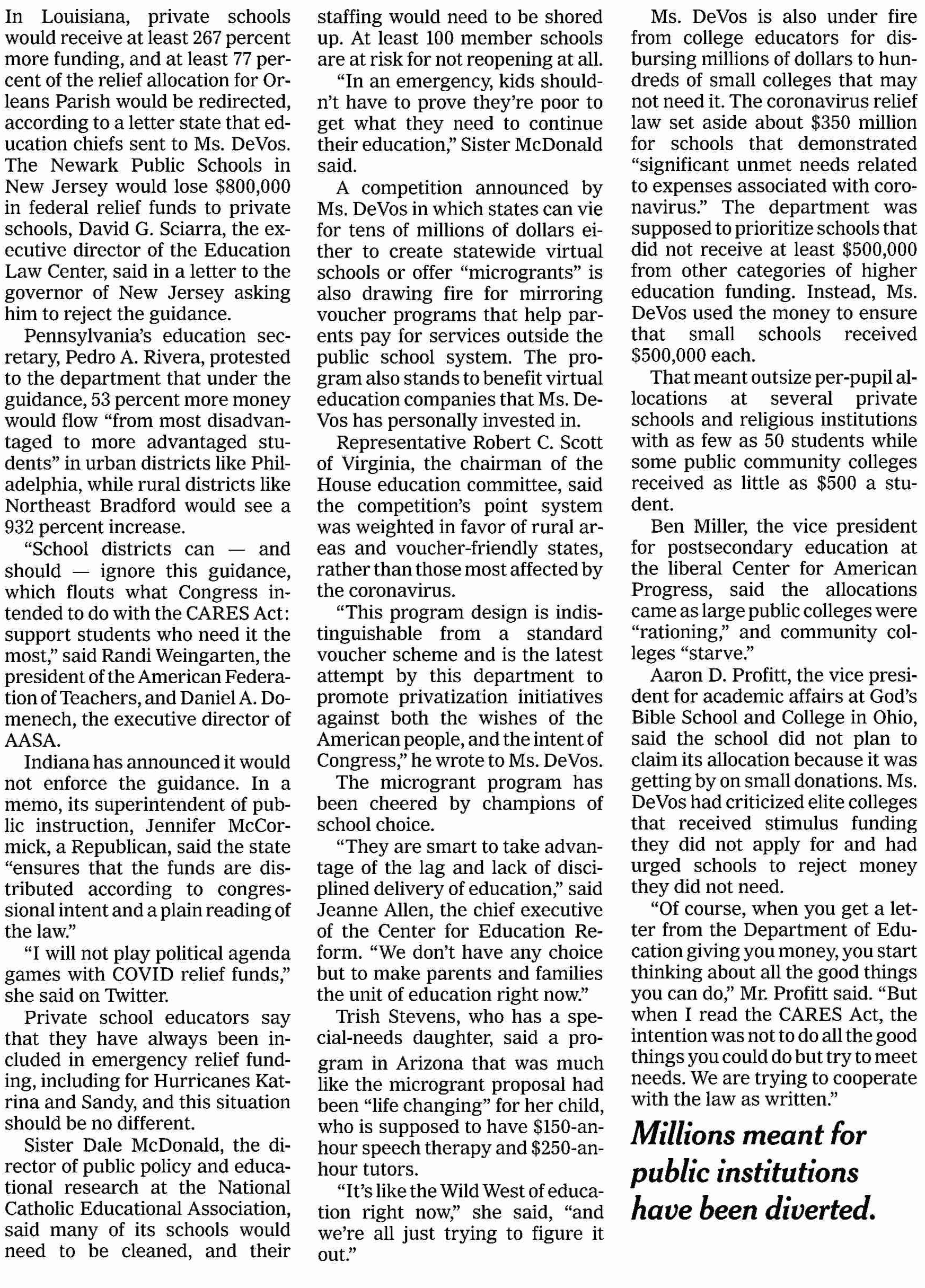 NY TImes: DeVos Funnels Coronavirus Relief Funds to Favored Private and Religious Schools